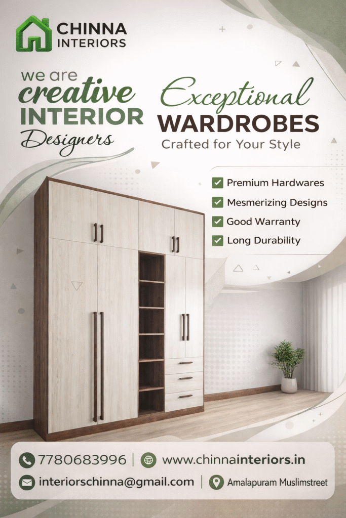 Choosing the right interior designer is an important decision, and Chinna Interiors makes that choice easy. As one of the best interior designers in Amalapuram, with strong presence in Rajahmundry and Kakinada, we combine creativity, experience, and honesty. Our customer-centric approach ensures personalized designs and smooth execution. We focus on long-term satisfaction rather than short-term trends. From consultation to completion, we stand by our clients at every step. Our interiors are designed to enhance lifestyle, comfort, and value. With a proven track record and growing client base, Chinna Interiors continues to set high standards. If you are looking for reliable, budget-friendly, and professional interior design services, Chinna Interiors is the right choice. Your dream space deserves expert care.